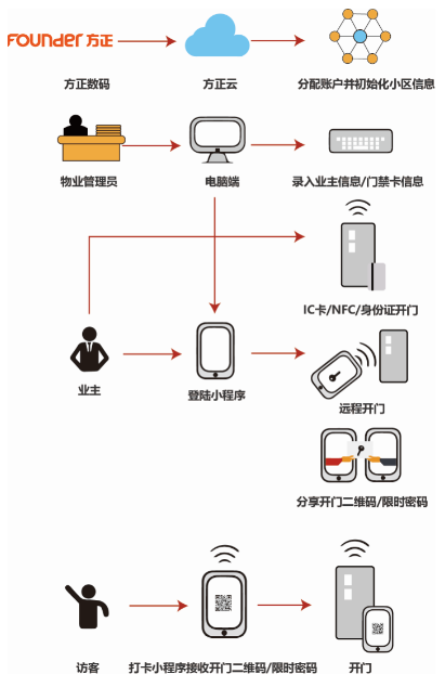 * 微信小程序远程开锁:物业端导入业主信息后,住户仅需注册信小程序“方正智能门禁”,手机联网就可以远程一键开锁。